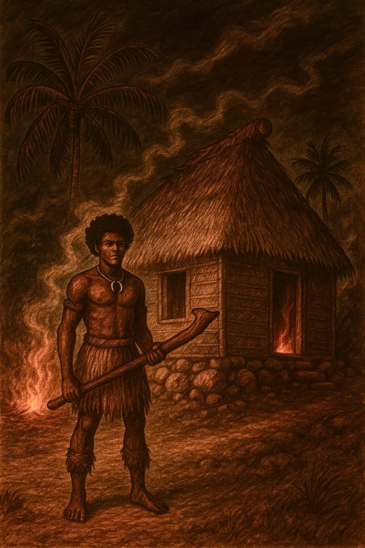 Naqera is not alone on this night patrol. He is accompanied by Sakapo Vodivodi, a powerful warlock. Sakapo was blind from birth and was an albino Fijian. He was from a clan of warlocks. He was endowed with the gift of foresight and knowledgeable in reading omens. Sakapo walked thru the village beside his chieftain. They had fought many battles side by side, his blindness an advantage amplifying his other senses to superhuman sensitivity. Being a Fijian Albino he was feared, his pinkish white skin, chisel body with fiery red hair caused ghostly fear thru any would be assailant. Sakapo Vodivodi hailed from the Clan of Burenitu, whose traditional role was “Bete” (Warlock), wise advisor and consultant to his chieftain.