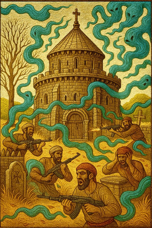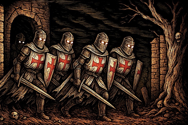 But at midnight, the air grew cold. From the stone walls of Kapell Sion, shadows stirred. Ghostly Templar knights stepped forth, armor rattling like thunder, eyes burning with pale fire. Sworn centuries ago to defend the innocent, they unsheathed their spectral blades and marched into the village.