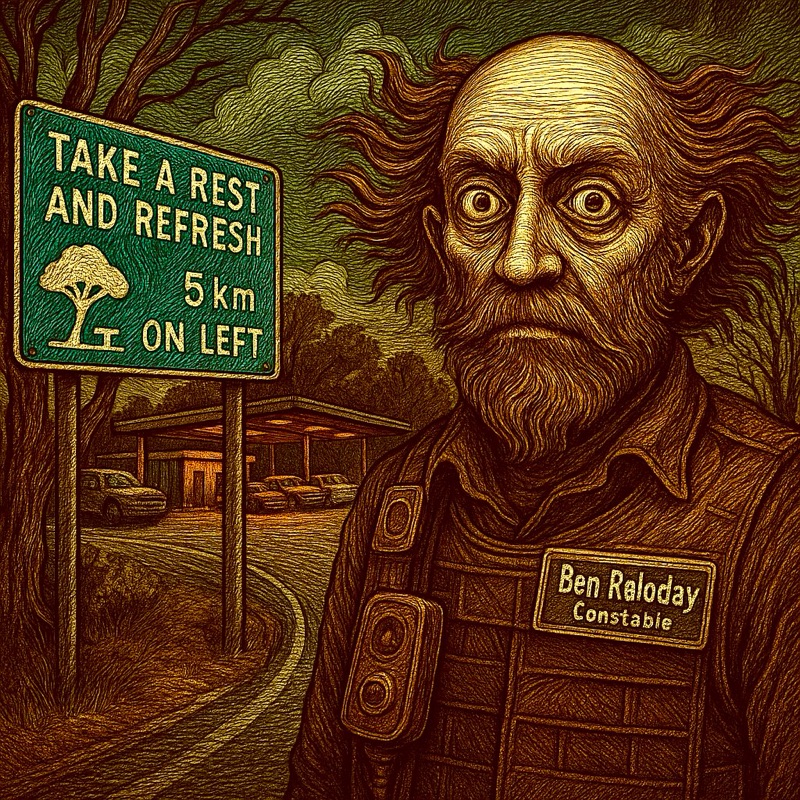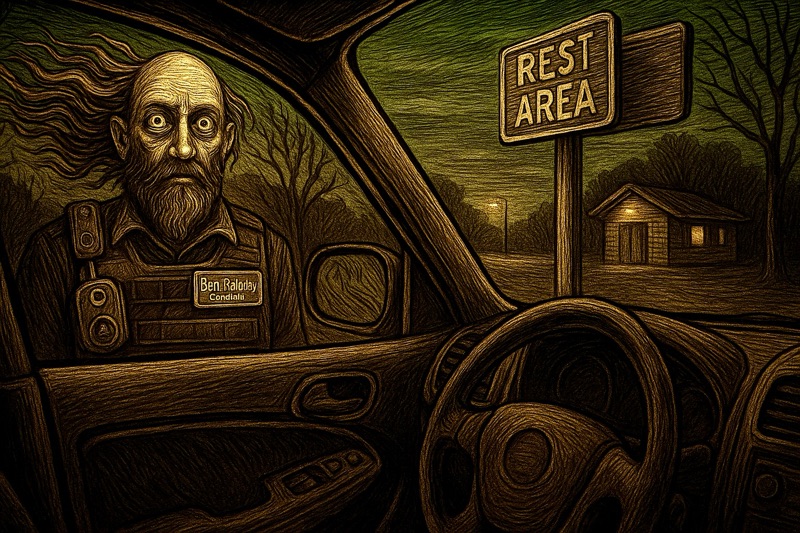 Penelope blinked and gasped. Somehow, they weren’t by the roadside anymore. They were in a lit Rest Area, the car neatly parked beside deserted washrooms.
