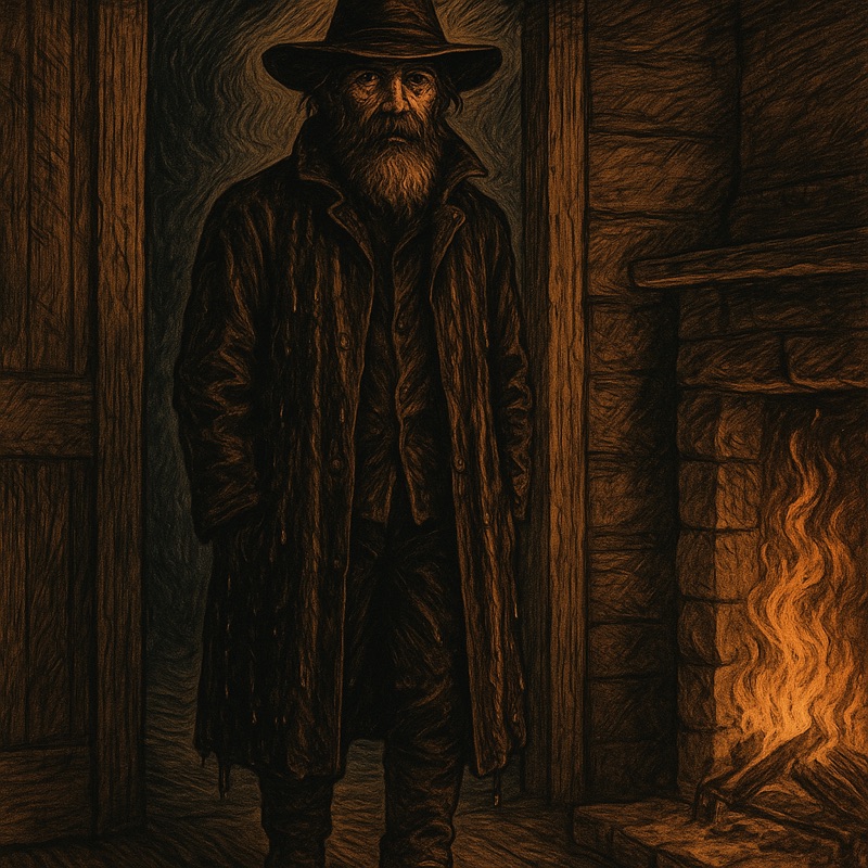 A figure lingered by the door, just beyond the fire’s glow—an older man, grey beard under an Akubra, oilskin horseman’s trench coat dripping wet, jeans tucked into bloodstone boots.
